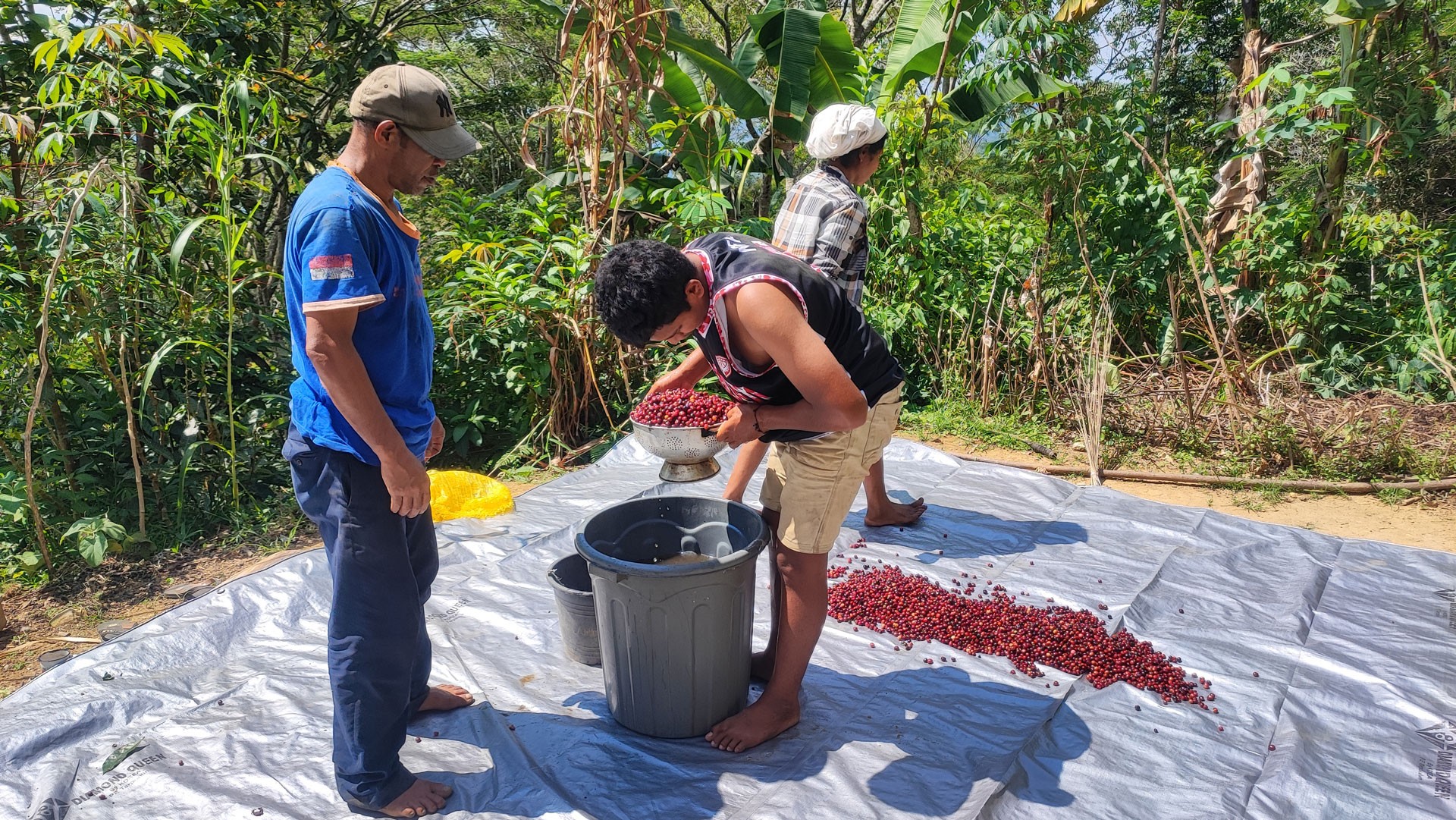 Danach werden die Kirschen im nassen Zustand in die Entkernungsmaschine ("Pulpermaschine") reingeworfen. Hier werden die Bohnen vom Fruchtfleisch abgetrennt und das Ergebnis wird in einen Reissack verpackt (ca. 60 kg). Anschließend wird eine Nacht offen in diesem Sack offen fermentiert. Dieser Verarbeitungsschritt ist wichtig, damit sich der Fruchtschleim von den Bohnen lösen kann, denn dies hat einen hohen Einfluss auf die Süße im Geschmacks nach dem Rösten.