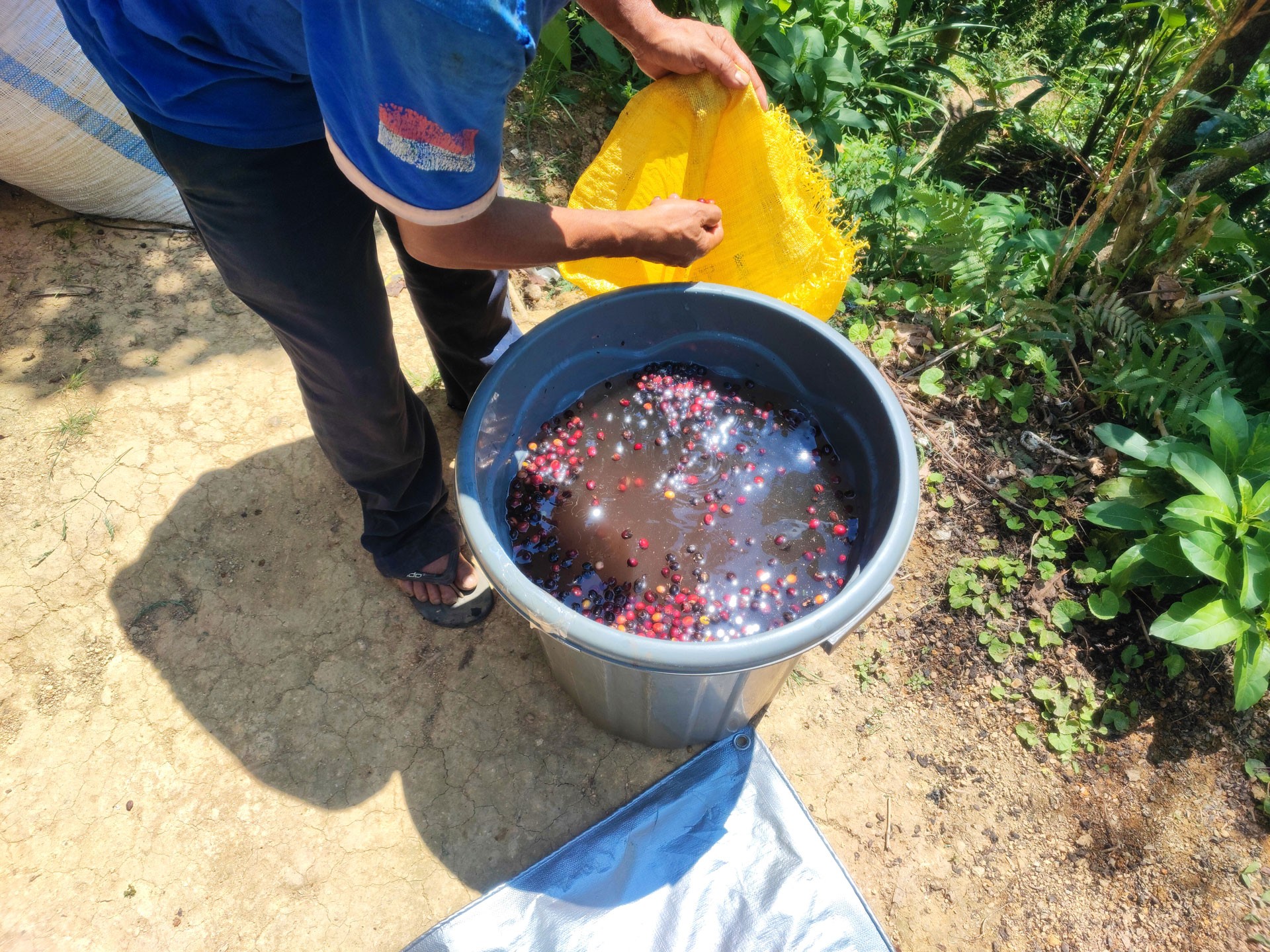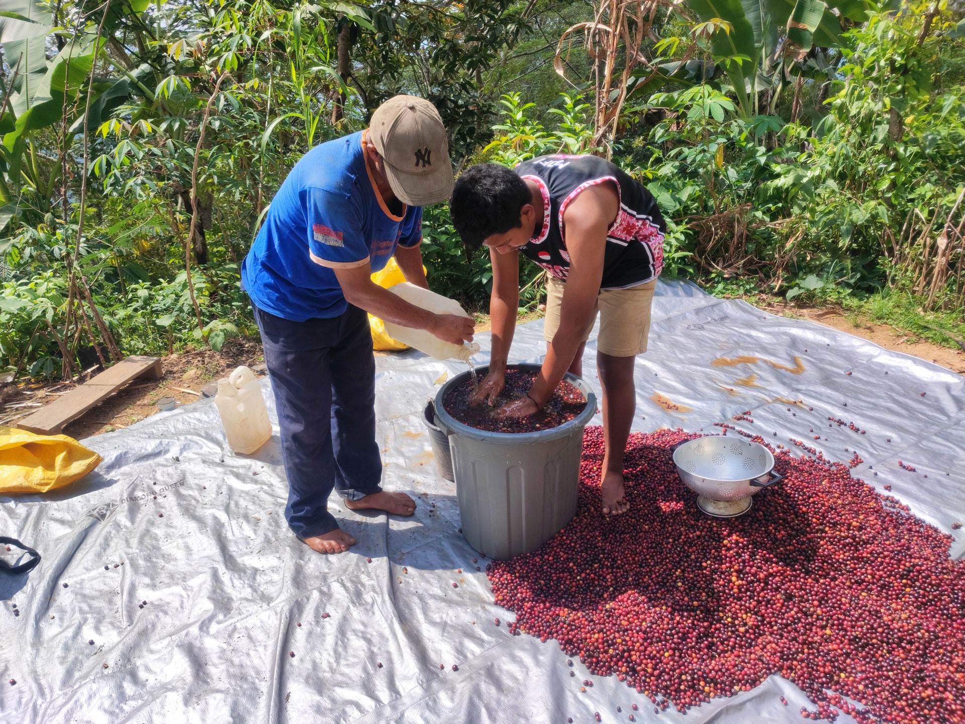 Bei diesem Prozess ist die Rohkaffeefarbe grüner als bei voll gewaschenen Aufbereitung. Da unsere Kaffeebauern aktuell (Stand April 2026) über keine Entschalungsmaschine zur nassen Aufbereitung ("Hullermaschine") verfügen, wird diese Aufbereitungsmethode nicht angewendet.